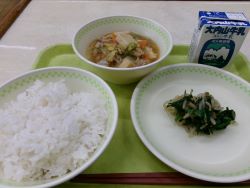今日の献立は、かしわのじゅんじゅん、ほうれん草の磯香あえ、麦飯、牛乳でした。ごちそうさまでした。
