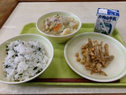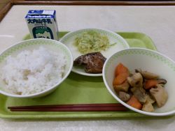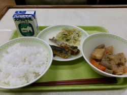 今日の献立は、いわしの南蛮漬け、大根のそぼろ煮、キャベツと小松菜のゴマあえ、麦飯、牛乳でした。ごちそうさまでした。
