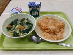今日の献立は、卵スープ、ヨーグルト、チキンライス、牛乳でした。ごちそうさまでした。