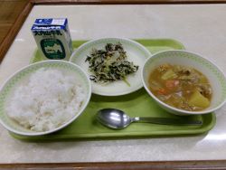 今日の献立は、ポークカレー、ひじきサラダ、麦飯、牛乳でした。ごちそうさまでした。
