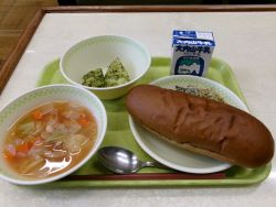 今日の献立は、さけのムニエル、野菜スープ、セルフあんぱん、牛乳でした。ごちそうさまでした。あんぱんを給食で食べるのは初めてかも・・・