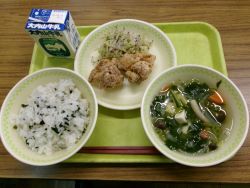 今日の献立は、とりのから揚げ、キャベツともやしのしそあえ、ほうれん草のすまし汁、わかめご飯、牛乳でした。ごちそうさまでした。