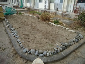 全校生徒力を合わせたチューリップ植えから約1ヶ月、チューリップの球根が植わっている菜園には雪が積もりました。春には元気に芽を出しますように。