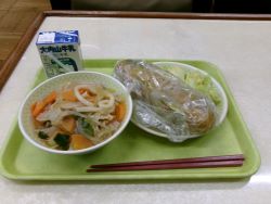 今日の献立は、信田うどん、キャベツの甘酢漬、美杉茶ときな粉の揚げパン、牛乳でした。ごちそうさまでした。