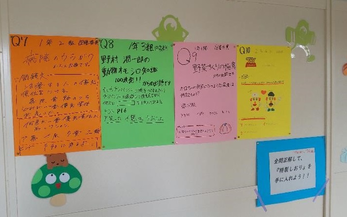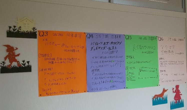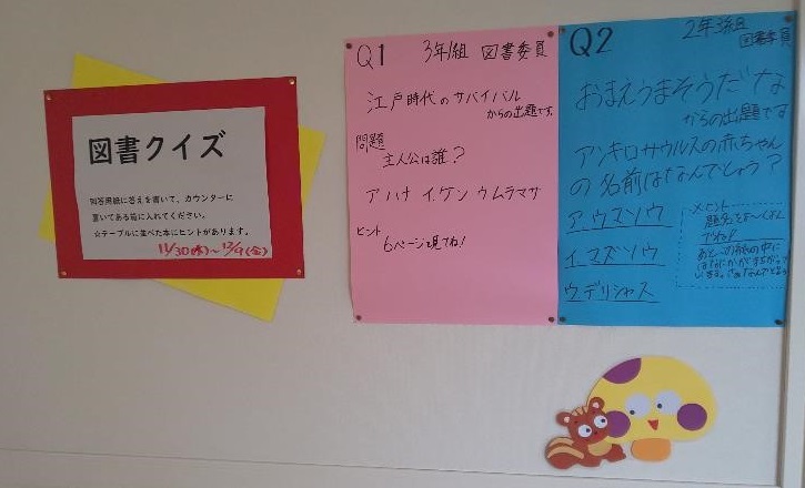 11/30(水)~12/9(金)までの期間、図書室前廊下に「図書クイズ」のコーナーがつくられています。各クラスの図書委員さんたちが、1問ずつ考えてくれたクイズが10問あり、コーナーに置かれている本にヒントがあるそうです。全問正解者には、美術部特製のすてきな「しおり」のプレゼントがあるとのことなので、私も挑戦してみようかなと思います。このクイズをきっかけに、多くの人たちが本に親しむ機会を持ってほしいなと思います。