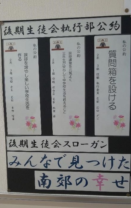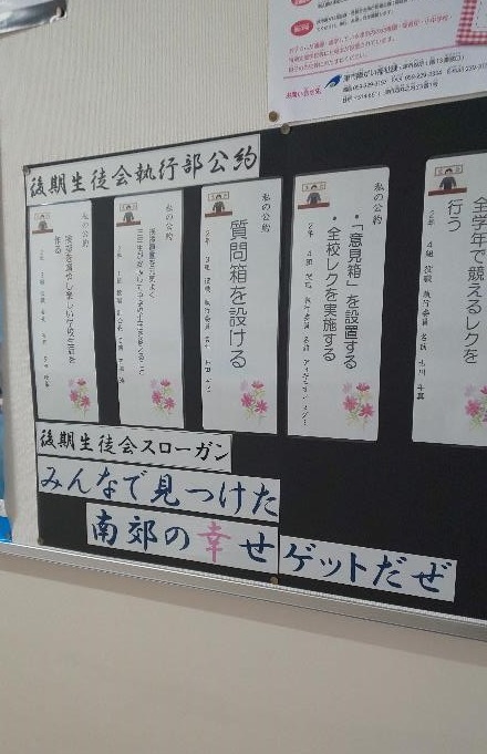 今回は、先日の生徒会役員選挙で選出された、後期生徒会のスローガンと、それぞれの役員さんたちの公約を紹介します。役員の皆さんと、それを支える生徒・職員1人ひとりの力で、南郊の幸せをいっぱいゲットしましょう!