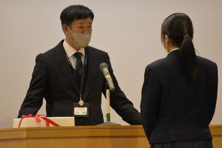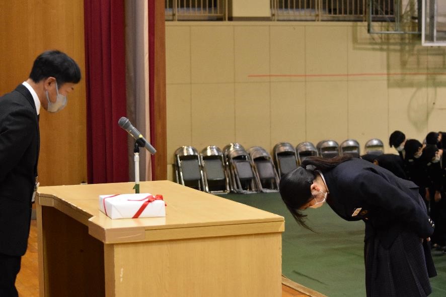 7日(木)の3年生卒業記念行事の始めに、1人1台タブレットの返還式を行い、3年生代表からお礼の言葉とともにタブレットを返していただきました。コロナ禍でも学びを止めないことや、個別最適な学び・協働的な学びを進めるために導入されたタブレット端末。実はこの3年生が、3年間使用した初めての学年になります。返還されたタブレットは、初期化して来年度入学生に引き継がれます。