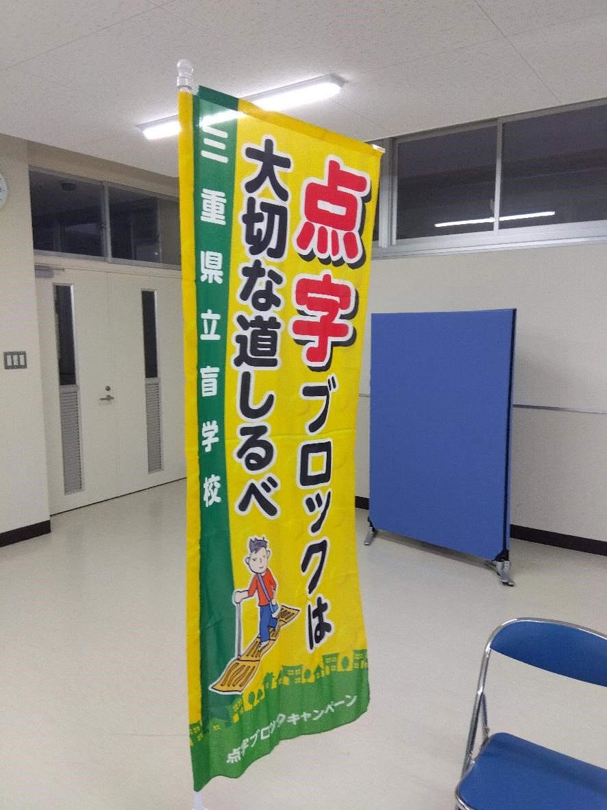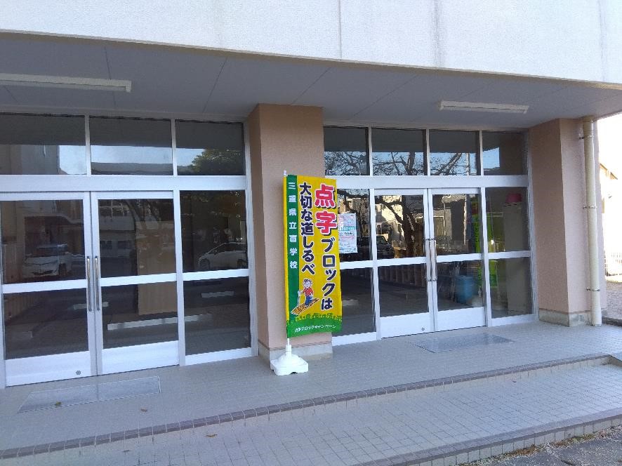 12日(火)の放課後に、お隣の県立盲学校の生徒4人と先生4人が本校を訪れてくださいました。盲学校が行っている、点字ブロックキャンペンーンの啓発活動として、盲学校の生徒会役員の人たちが、本校の生徒会役員に趣旨説明をしていただいた後、のぼり旗、ポスター・ポケットティッシュの啓発物品を受け取りました。本校の生徒会長からお礼の言葉とともに、「点字ブロックがどれだけ大切かが分かった。目の不自由な方が困らないように、点字ブロックに物を置いたり邪魔になるようなことはしないようにするとともに、みんなにも呼び掛けます」と返していました。大切なのは、私たち1人ひとりの行動ですね。
