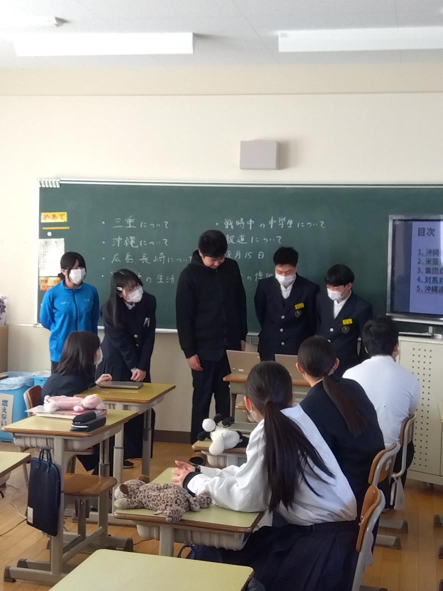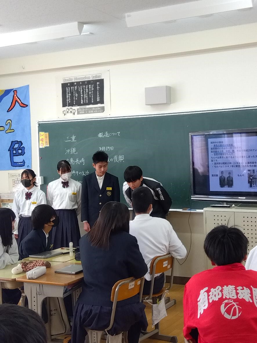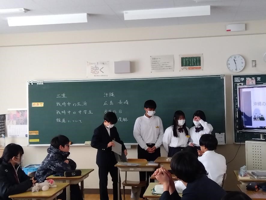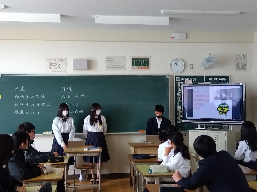 26日(月)の3,4限目に、2年生平和学習で各班で調べたテーマについてクラス内で発表をする時間を取りました。出会い学習でお世話になった、亀井カノンさん・浩さんもお招きして、各クラスでの発表の様子を見ていただき大変喜んでいただきました。調べたことを発表することで、何を伝えたいのかという事を大切に、今後も学習を深めていってほしいと思います。