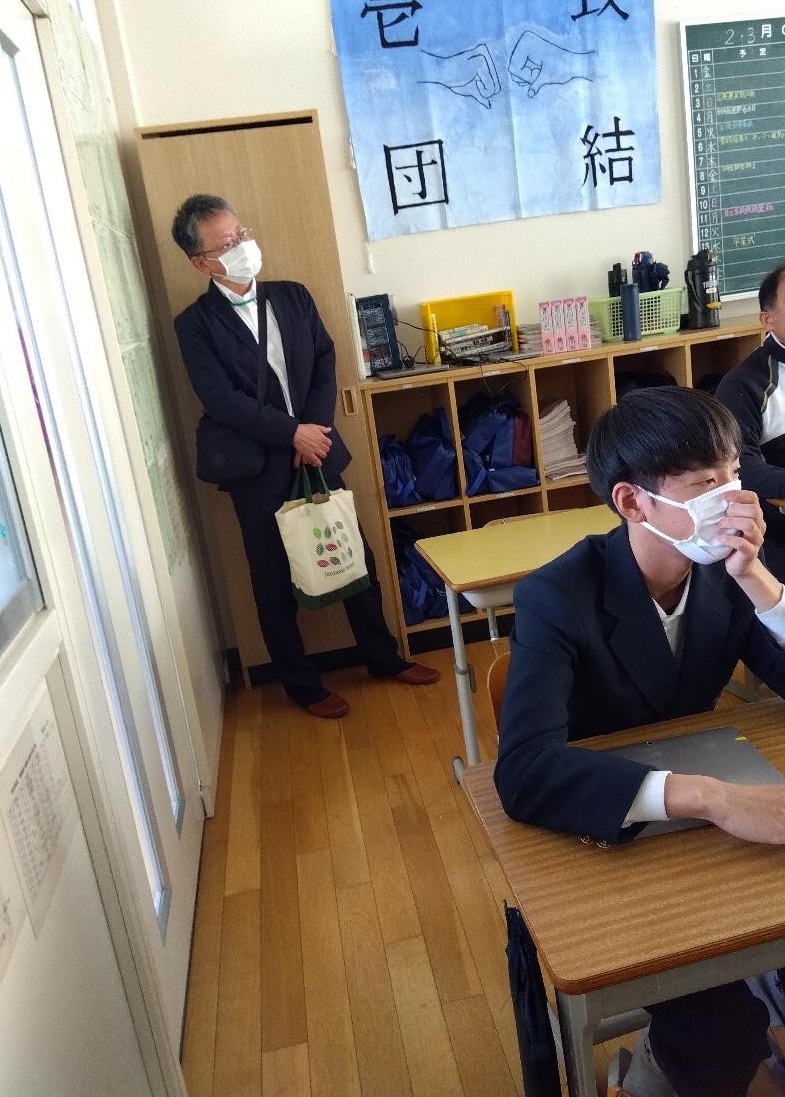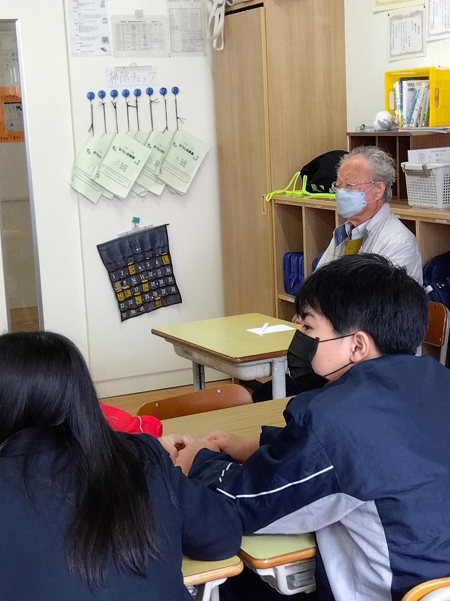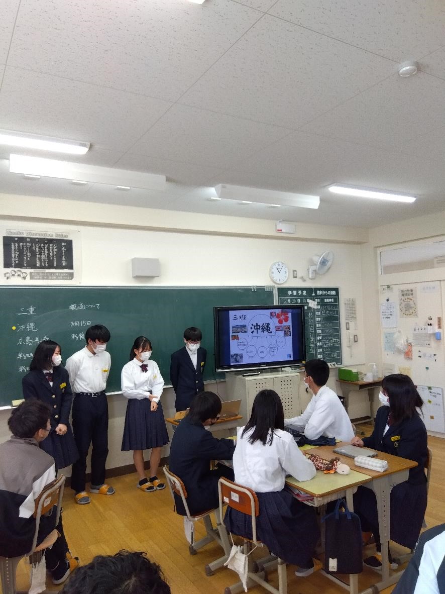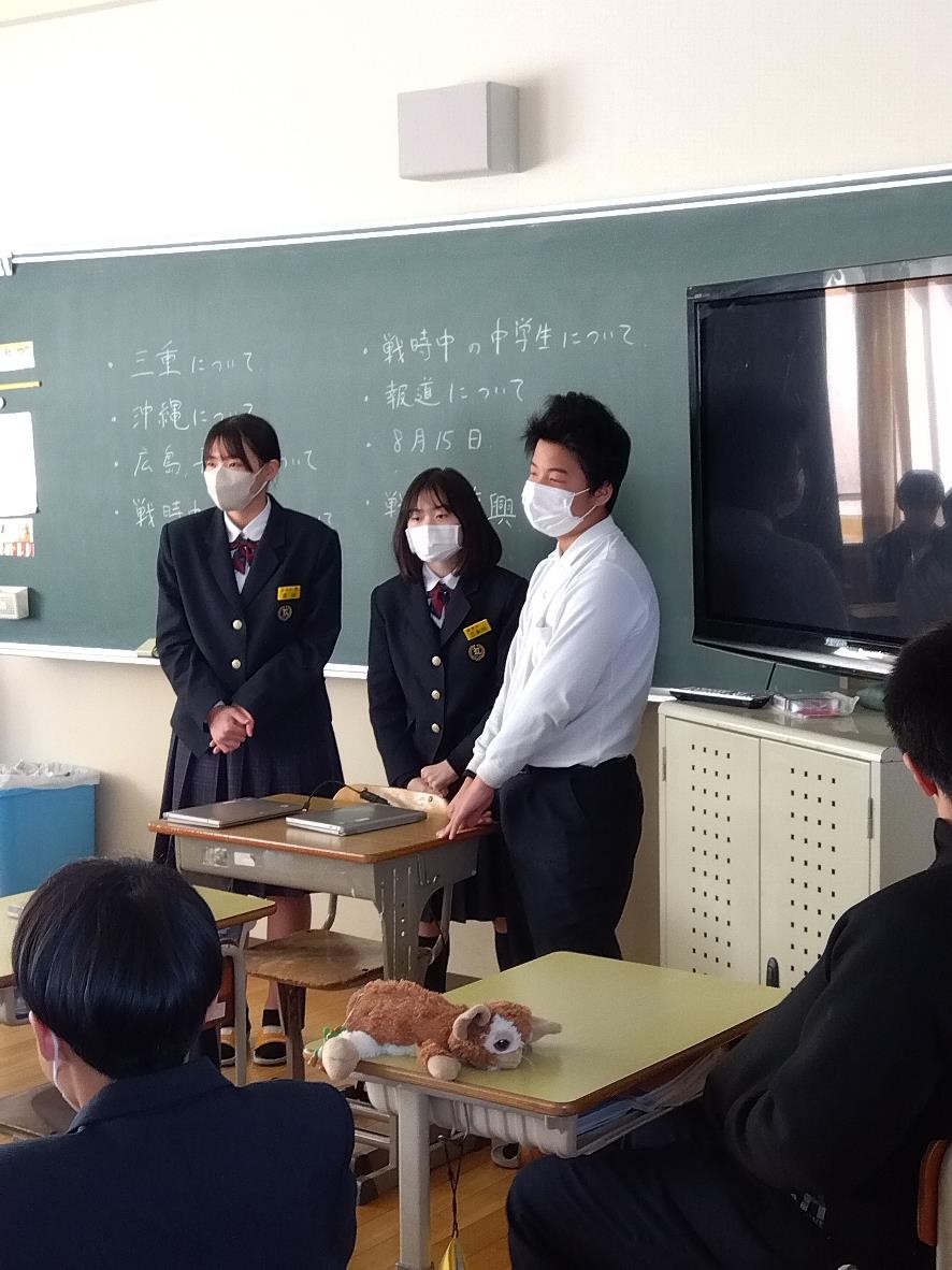 26日(月)の3,4限目に、2年生平和学習で各班で調べたテーマについてクラス内で発表をする時間を取りました。出会い学習でお世話になった、亀井カノンさん・浩さんもお招きして、各クラスでの発表の様子を見ていただき大変喜んでいただきました。調べたことを発表することで、何を伝えたいのかという事を大切に、今後も学習を深めていってほしいと思います。