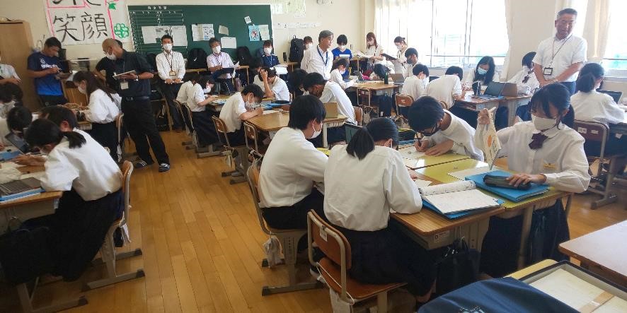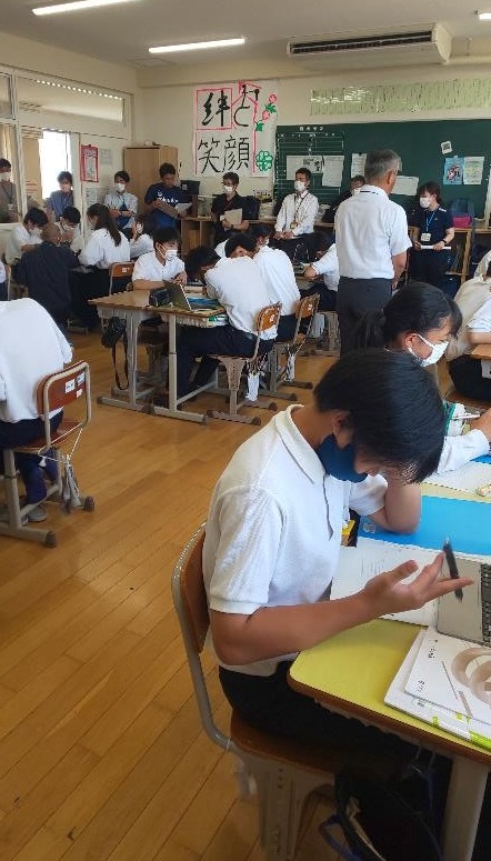 19日(月)の5限目に「外国につながる子どもの教育支援プロジェクト事業」の公開授業研究会をしました。大学教授や教育委員会、市内小中学校の先生方など30人以上の参加者があり、みんなで2-1の数学の授業を見た後に、安心して学ぶことが出来る授業になっていたのかについて話し合いをしました。