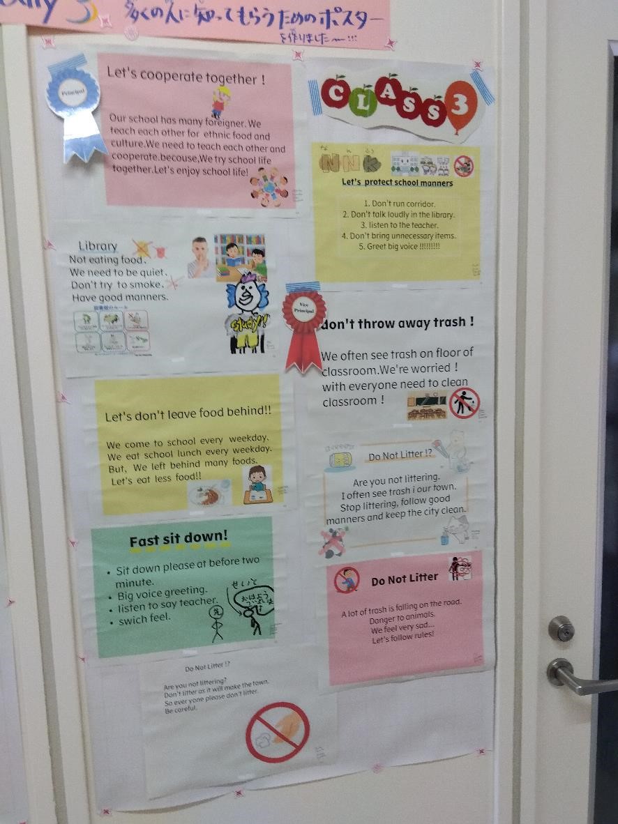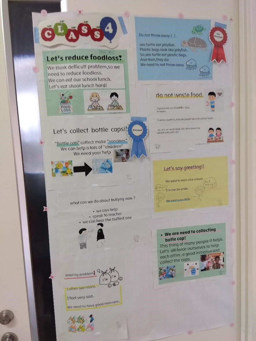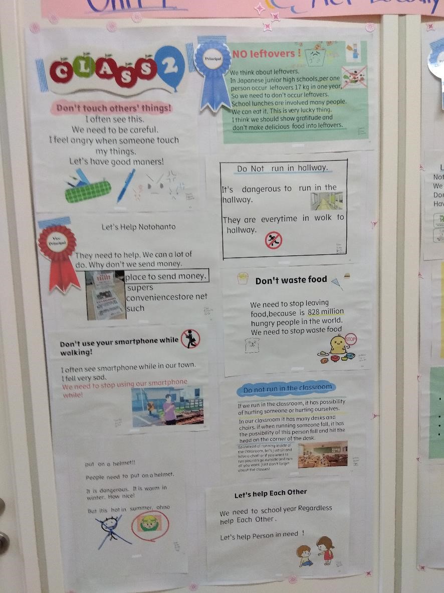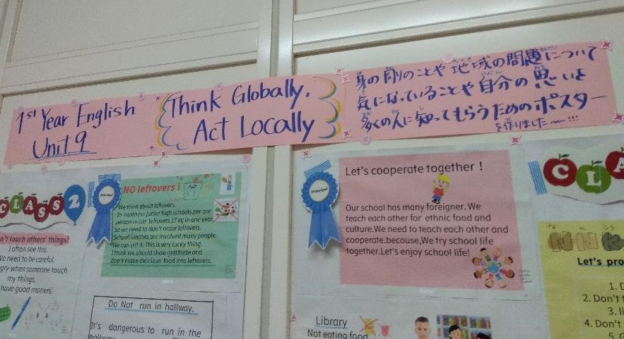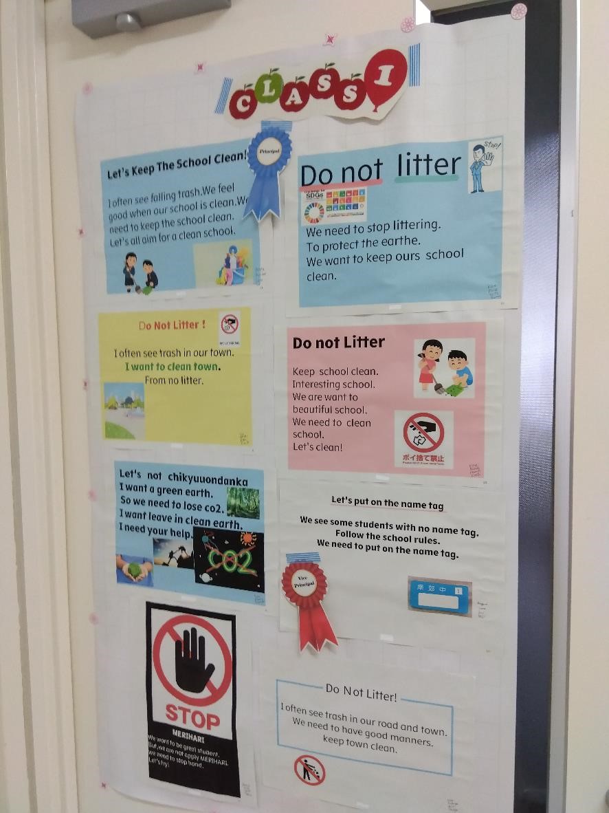 少し前の話になるのですが、1年生の英語の時間に、身の回りの問題について、自分が気になっていることや自分思いを多くの人たちに知ってもらうためのポスター作りに取り組んでもらいました。中身は、この学校に沢山いる外国につながる仲間たちのことや、能登半島地震のこと、給食の食べ残しのこと、ごみのポイ捨てについてのこと、環境問題に関すること、歩きスマホのことや、名札をつけること等々、それぞれの生徒が考えたことや自分の思いを英語でポスターにしてくれています。今、その作品たちが、生徒昇降口から本館に向かう壁の所に、クラス別で掲示されていますので、ぜひゆっくり見てください。因みに、赤いリボンが校長賞、青いリボンが教頭賞です。