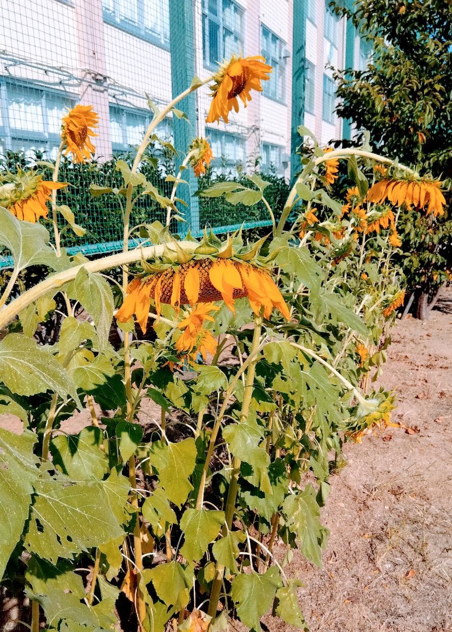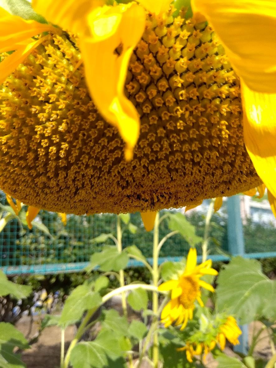 9月の中旬に見ごろを迎えた、ひまわり畑のひまわりたち。元気に太陽を向いていましたが、そろそろうつむき加減になってきました。よく見ると、種ができかけています。来年はもっと早くから、もっとたくさんの花を見られるようにしたいなと思います。