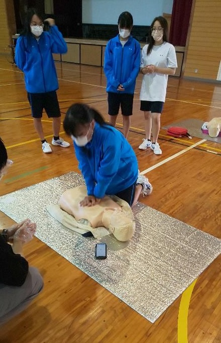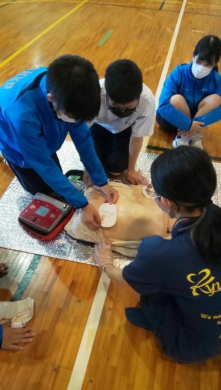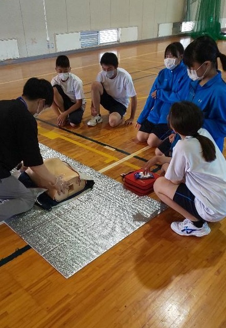 今日の午前中、2年生各クラスの救命講習を行いました。三重大学医学部の「きゅうめい部」の皆さんを講師に迎え、1クラスずつ話を聞いたり、実際に心臓マッサージとAEDの実習をさせていただいたりしました。
