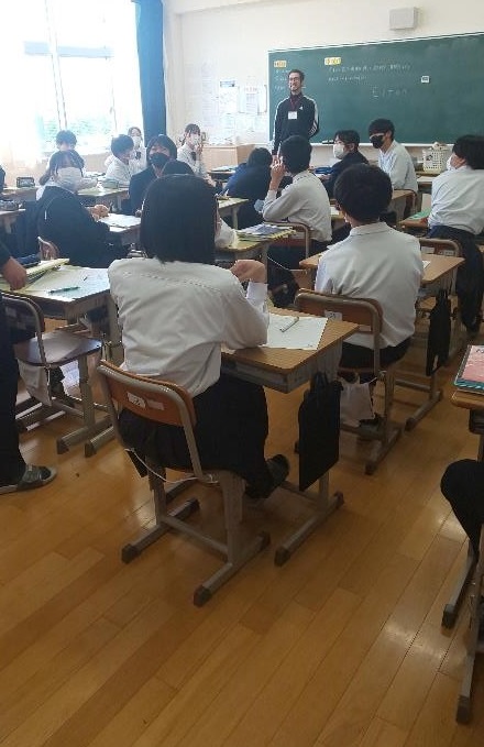 今日から、チーム南郊に新たなメンバーが加わりました。ALTのビテンクール・エルトンです。月曜日と水曜日に、各学年の英語の授業を担当してくれます。今日はさっそく、3年生の各クラスで、自己紹介も兼ねて授業をしてくれて、生徒からの英語の質問に楽しく答えてくれていました。