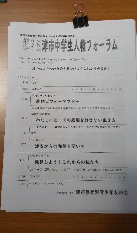 8月28日(日)の午前中に、三重県人権センターで、津市中学生人権フォーラムか開催されました。市内の17中学校から、70名を超える中学生の参加があり、本校からも5名の生徒たちが参加をしました。