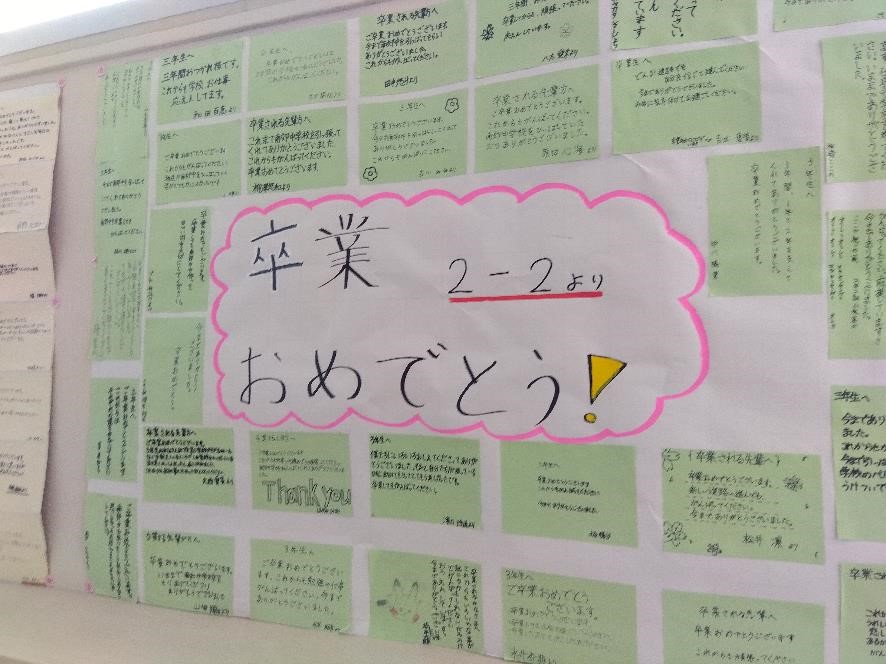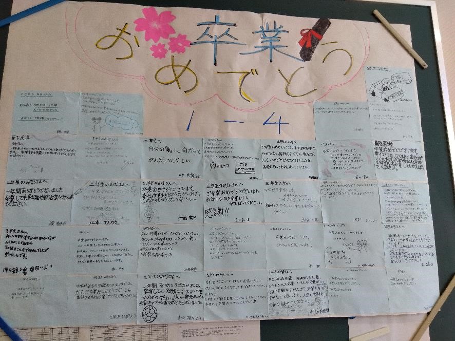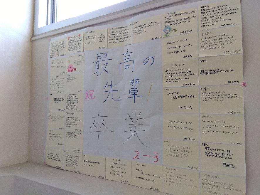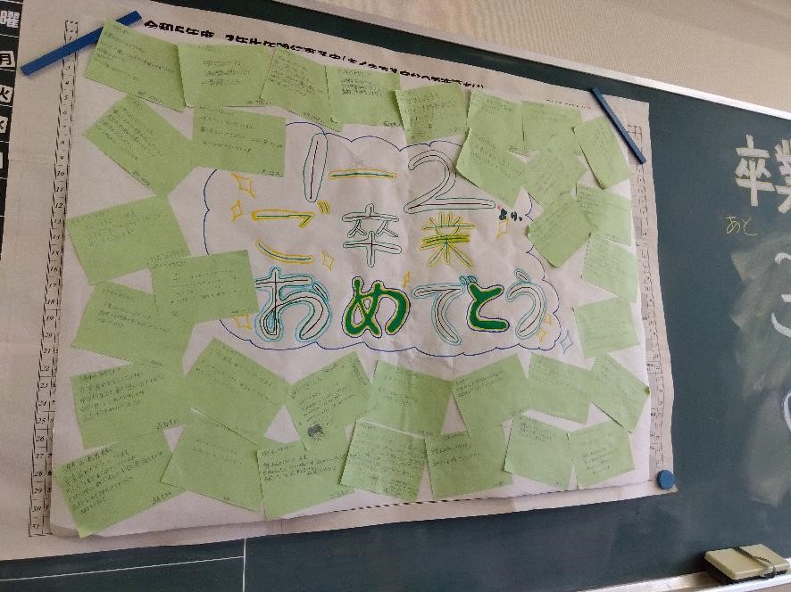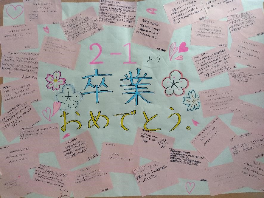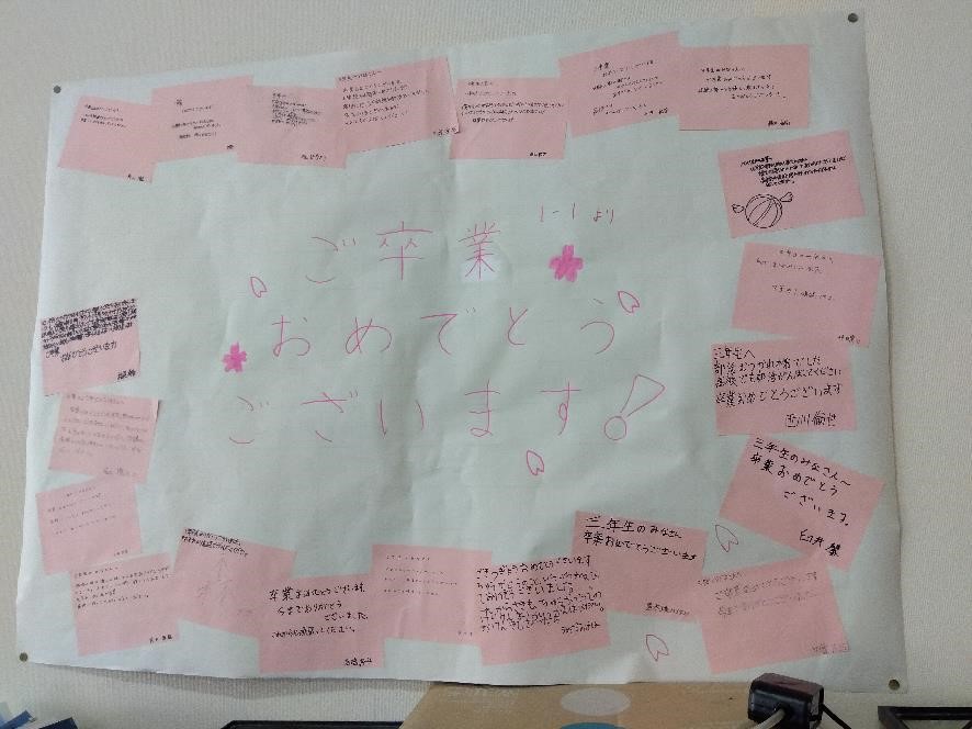7日(木)の卒業式練習の時間に、1,2年生各クラスの代表から3年生に向けたメッセージ集の贈呈が行われました。1,2年生の生徒1人ひとりが、模造紙にメッセージを書いたり、貼り付けたりして思いを伝えました。その模造紙は、3年生が使う西階段と、3年生の教室に掲示されています。みんなの思いを受け取り、胸を張って卒業してほしいと思います。