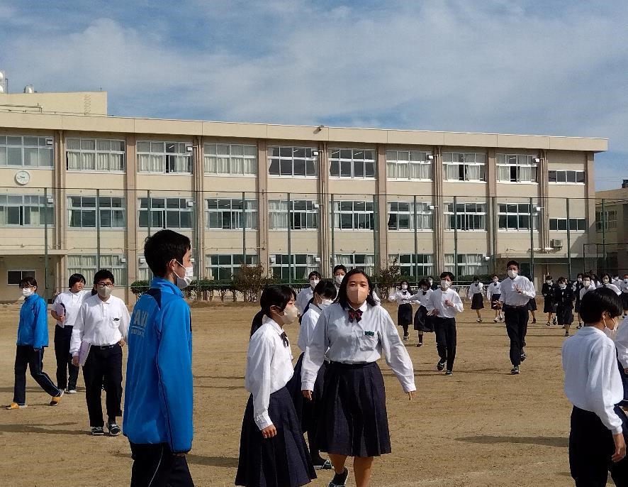 23日の2限目に、抜き打ちで避難訓練を行いました。突然やってくる地震に少しでも近づけるために、今週のどこかで訓練をするという事だけ伝えて突然地震発生の放送を入れました。避難開始の放送から全員集合・点呼が終わるまで5分30秒。抜き打ちにしてはまずまず素早い避難ができたと言えます。しかし、当然の事ながら本当の地震は予告はしてくれません。しかも大きく揺れたり、ガラスが割れたり、物が落ちてきたり・・・。そんな中で、パニックにならず避難するには、まだまだ備えが必要です。加えて中学生は、災害強者として、地域から期待をされている存在でもあります。