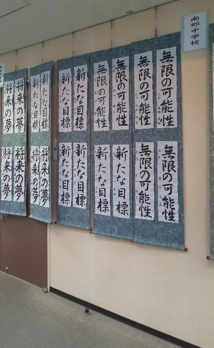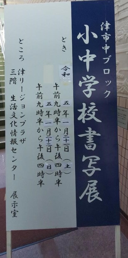 21日(土)・22日(日)の2日間リージョンプラザで、津市中ブロック小中学校書写展が開催されました。本校からも、1~3年生で20の力作が出品され、沢山の人たちに見てもらっていました。