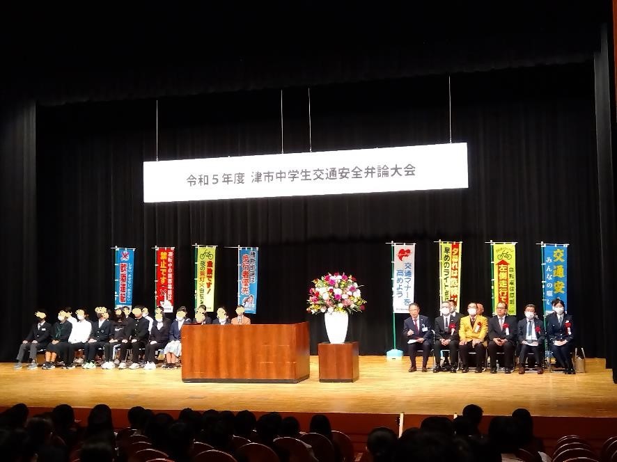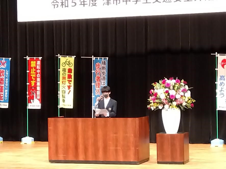 17日(金)にリージョンプラザお城ホールで、津市交通安全対策会議主催の津市中学生交通安全弁論大会が開催されました。本校からは、2年生の安田伍希さんが参加し、友だちの事故を目の前で見た時の事を踏まえて、今思っていることや考えていることを述べてくれました。話の始めと終わりに、「交通事故に関する意識はどうですか?」と問いかけて、聞いている人たちの変化を促す良い弁論でした。テスト明けの全校集会で発表してもらおうと思います。