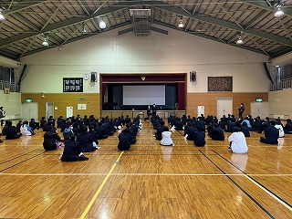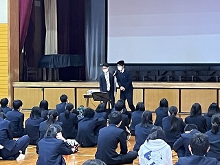 思い出のスライドあり、懐かしい先生からのメッセージあり、メインは先生の漫才や歌のプレゼントでした。