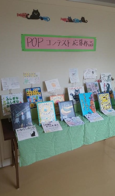 昨日から、図書室前の廊下に、図書委員会主催のポップコンクールの作品が展示されています。自分が好きな本、読んでもらいたい本をポップを使ってみんなにアピールしています。このページには画質の制限があるため、きれいな写真が載せられなくて残念ですが、どの作品もとってもステキで、思わず手に取って本を読みたくなりました。