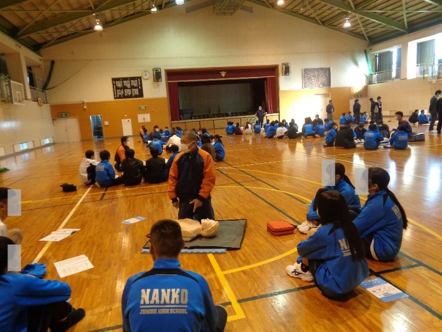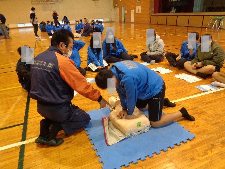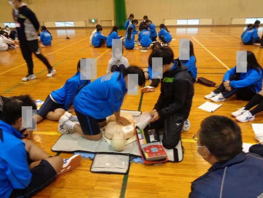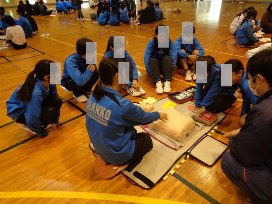 27日(木)に、消防署の方々を講師に招いて2年生で、救命講習を行いました。学年を11のグループに分けてそれぞれのグループで、人形を使っての胸骨圧迫(心臓マッサージ)とAEDの使い方の体験をさせていただきました。生徒たちは、大きな声で助けを呼んだり、実際に体育館にあるAEDを取りに走ったりしながら一生懸命実習をしていました。