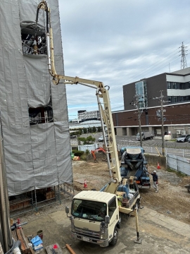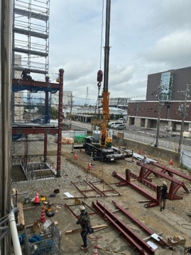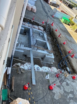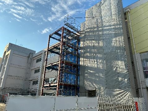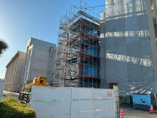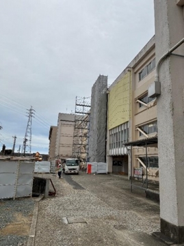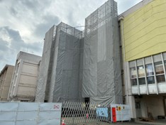 足場にネットがかかり全く見えません。廊下が暗いです。