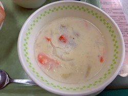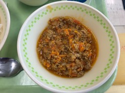 さつまいもがすり潰されてはいっている黄色いシチューだと勝手に思っていました。大きめのさつまいもは入ってました。