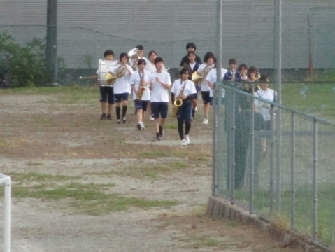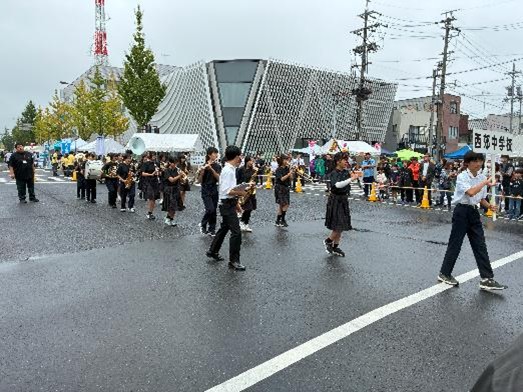 パレード途中での演奏です。たくさんの保護者の方や3年生のOB、OG、卒業生OB、OGが横を一緒に歩いてくれました。有難うございました。