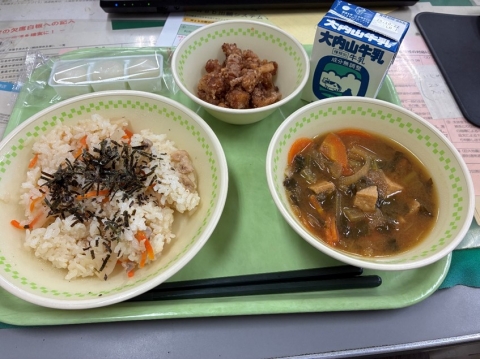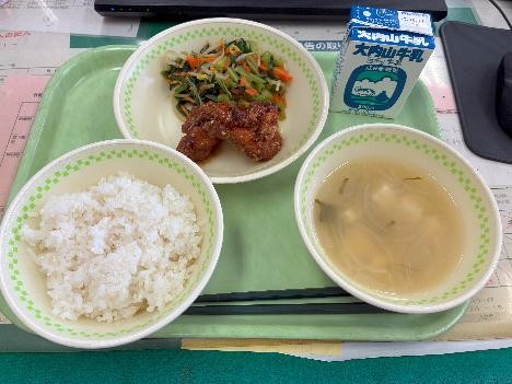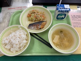 麦飯 牛乳  鰆の一味焼き  ごま酢あえ  湯葉のすまし汁