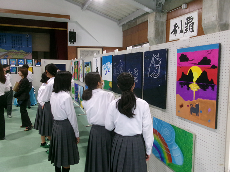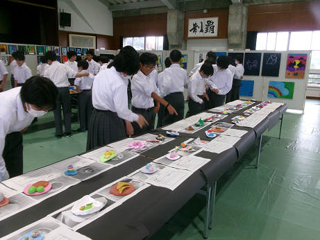 美術部、美術科、家庭科、各学年、PTAの作品をそれぞれ見学しました。