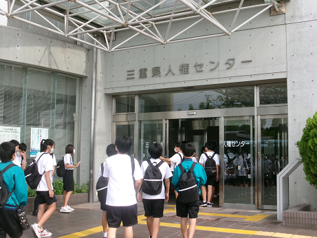 朝の学活後、バスで三重県人権センターへ。