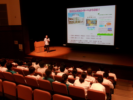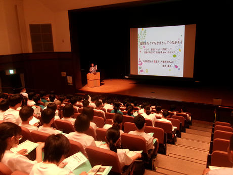 まずは学年全体で講演会。講演者との出会い学習です。