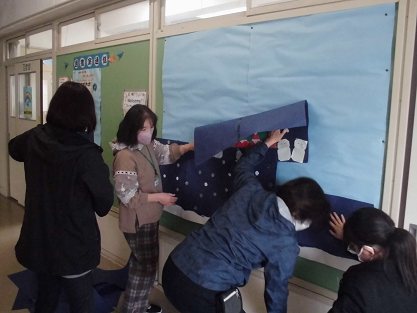 12月に向けて図書室前廊下の壁面も模様替えです。