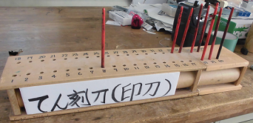 てん刻刀という特殊な道具を使って彫り進めます。
