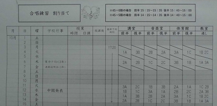 教室だけでなく、講堂、音楽室、体育館に、練習場所が割り当てられています。