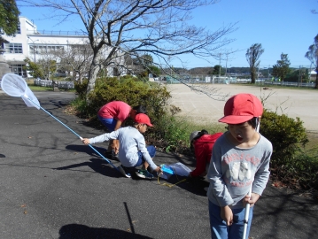 よいお天気に恵まれて、気持ちのよい日になりました。前から、子どもたちが「虫取りをしたい。」と言っていたので、実施しました。トンボがたくさん飛んでいて、たちまち虫かごにいっぱいになりました。神社の近くまで探しにいきました。カマキリやバッタを探していたのですが、いませんでした。最後にトンボを全部逃がしてあげました。