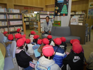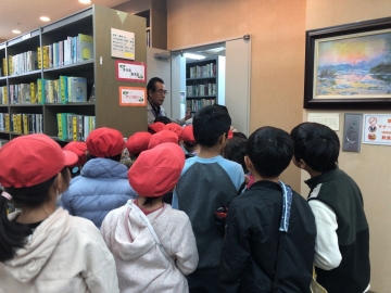 図書館では、図書館の使い方やマナーなどを布絵本を使って説明していただきました。また子どもたちから出た図書館に関する質問などにも答えていただき、図書館についてたくさんのことを知る機会となりました。