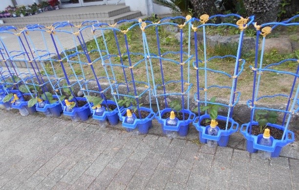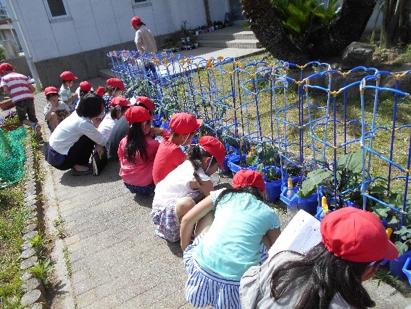 生活科の授業で、昨年チューリップを植えていた鉢に自分の好きな野菜を選んで植えました。野菜の種類はミニトマト・ナス・オクラ・ピーマンです。どの葉っぱがどの野菜かを話しながら自分の苗を選んでいました。また野菜の苗をポットから取り出すのが難しかったようですが、お互い声を掛け合いながら、頑張っていました。観察では、「トマトの葉っぱからトマトのにおいがするよ」「葉っぱがざらざらする」「オクラの葉っぱがハートの形だった」というように、葉っぱの形や大きさ、手触りやにおい等に気を付けて観察できていました。