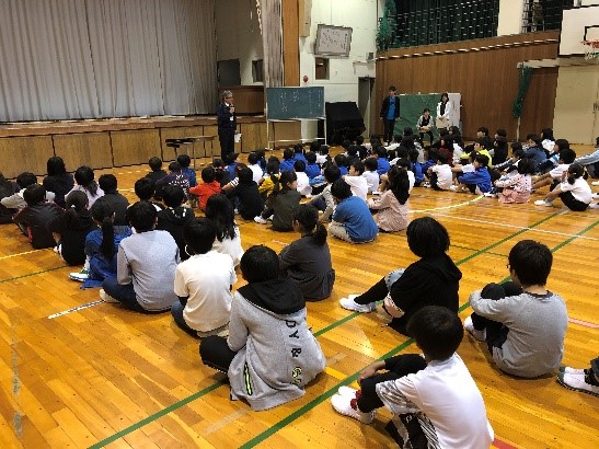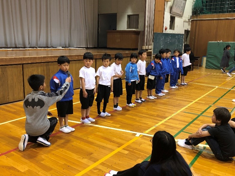 17日(水)5限目、全校集会がありました。明合小は毎月1回程度、児童会主催の集会を開いています。今回の集会では1年生が自己紹介をしました。名前のほかに、好きな食べ物を発表しました。全校児童が見ている前で話すのは緊張しましたが、どの子もしっかり話すことができました。