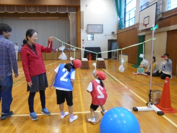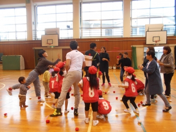 子どもたちが考えた4つの競技で、子ども運動会をしました。子どもたちは、お家の方と一緒に走ったり、綱引きをしたり、玉入れをしたりして、とても楽しそうにしていました。