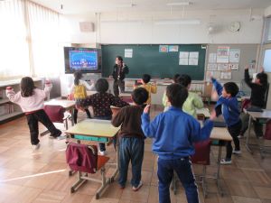 1・2年生が英語活動をしました。英語でのあいさつをした後に、音楽に合わせて簡単な動作を表す言い方を学び、楽しく体を動かしながら英語と触れあっていました。