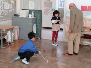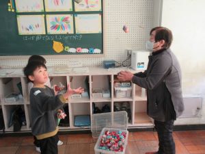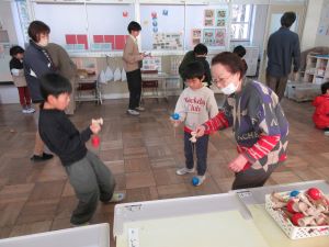 ↑児童は二人ずつペアになって、まず5種類の遊びを順番に体験しました。お手玉では2個同時に球を投げて受け止めることに苦戦している子もいましたが、うまくいくととてもうれしそうな表情をしていました。