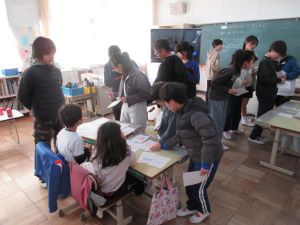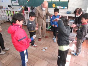 ↑体験の後半では、違う遊びも教えてもらいました。めんこにたくさんの児童が集まり、たたきつける場所などのアドバイスをもらいながら楽しむことが出来ました。