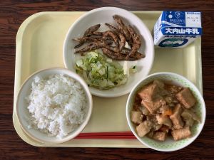 【献立】麦飯、きびなごのから揚げ、里芋と大根のそぼろ煮、白菜漬け、牛乳