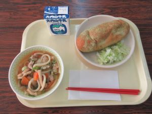 【献立】お茶ときな粉の揚げパン、信田うどん、キャベツの甘酢漬け、牛乳