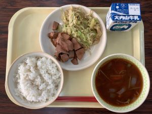 【献立】麦ごはん、いわしの甘露煮、豚汁、白菜の青じそあえ、牛乳