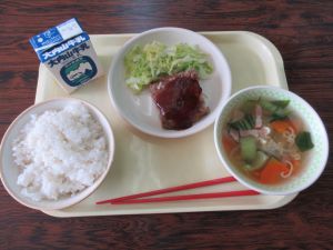 【献立】麦飯、おからいりミートローフ、添えキャベツ、ABCスープ、牛乳