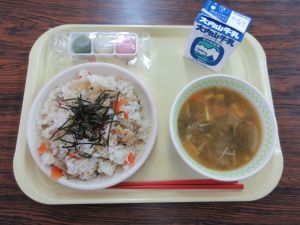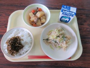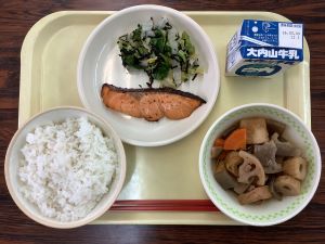 【献立】麦飯、鮭の生姜焼き、白菜となばなのいそあえ、五目煮、牛乳